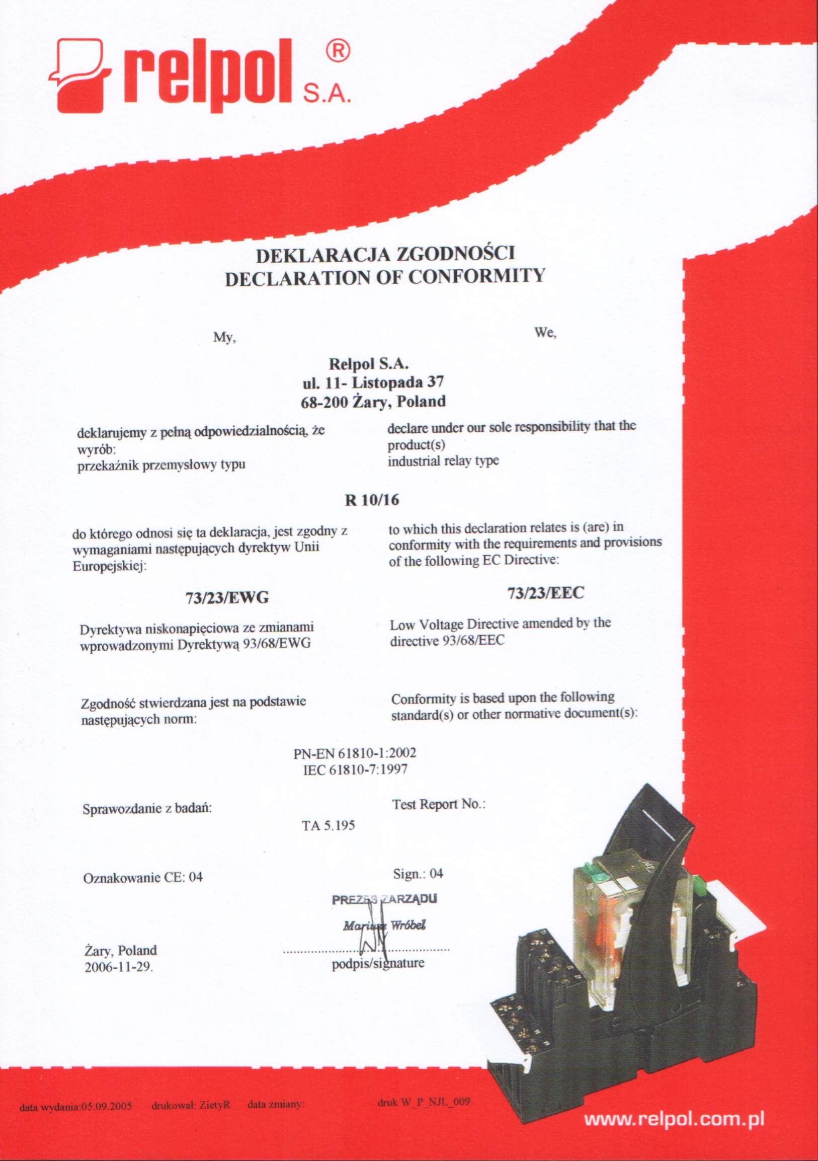 Przekaźnik elektromagnetyczny R10/16-1022-46-3024 przemysłowy - małogabarytowy, w obudowie. Do podłączeń wsuwkowych - Faston 250 (6,3x0,8). Wyjście: 2Z - dwa zestyki zwierne - wyprowadzenia: 11(4)-14(3); 21(6)-24(5); AC1 - 16 A / 250 V; DC1 - 10 A / 24 V. Wejście / cewka - wyprowadzenia: A1(1) - A2(2), napięcie zasilania Un - 24 V AC. Wymiary: 35 x 35 x 64 mm. Materiał styków: AgCdO. Montaż na płycie montażowej 2 wkrętami M4. IP 40.