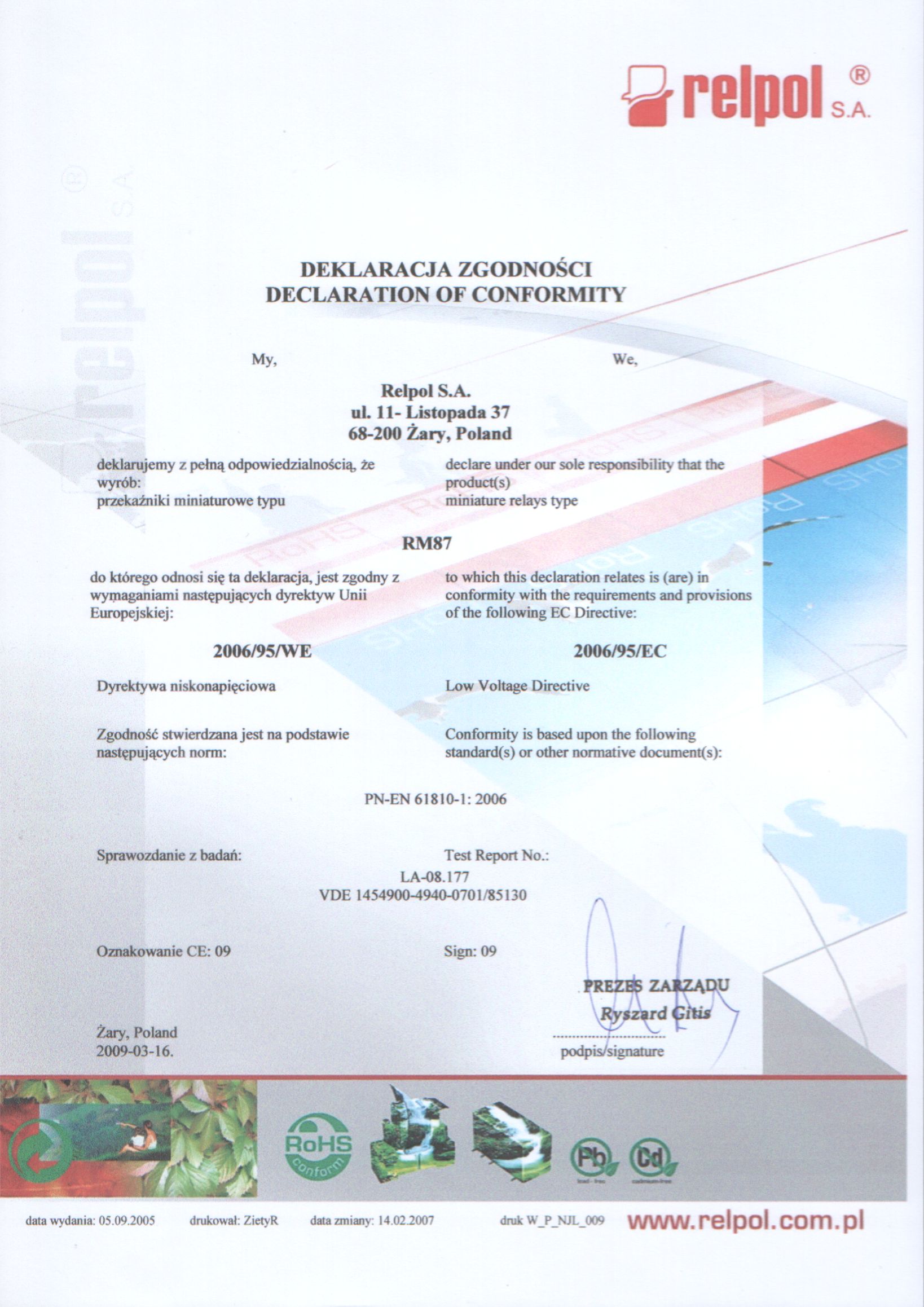 Przekaźnik elektromagnetyczny RM87N-2011-35-1060 miniaturowy, do obwodu drukowanego i gniazda wtykowego. Raster 3,5 mm. Wysokość 15,7 mm. Wyjście: 1P - jeden zestyk przełączny - wyprowadzenia: 11(4)-12(3)-14(5); AC1 - 12 A / 250 V; DC1 - 12 A / 24 V. Wejście / cewka - wyprowadzenia: A1(1) - A2(2), napięcie zasilania Un - 60 V DC. Wymiary: 28 x 12,7 x 15,7 mm. Materiał styków: AgNi. IP 67. Opcje montażu gniazd: EC35, GD35 - do druku; GZT92, GZM92, GZS92 - montaż na szynie 35 mm lub przykręcane do płyty jedną śrubą M3. Wymiary zestawu przekaźnik + gniazdo + obejma wskazane są w opisie wybranego gniazda.