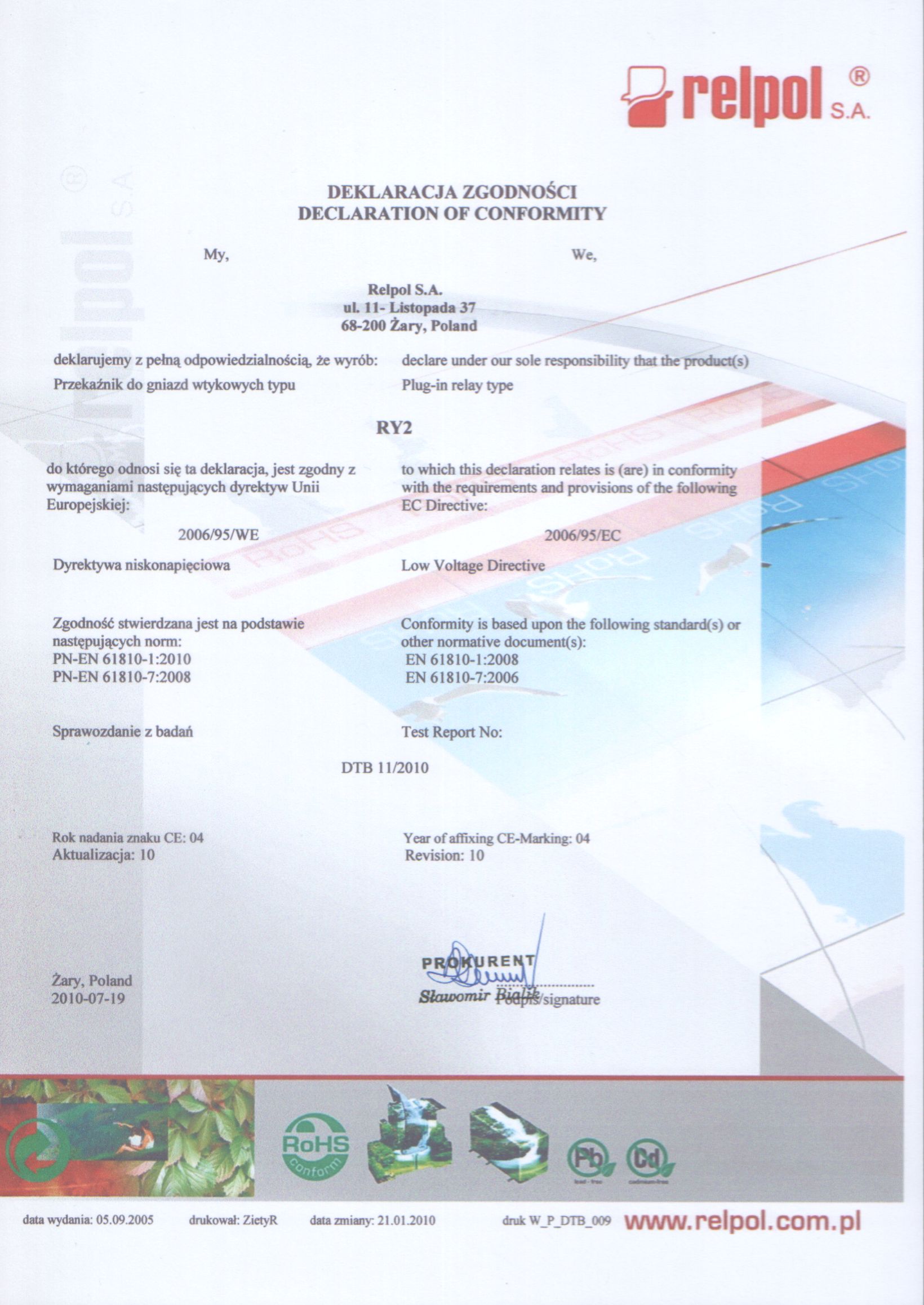 Przekaźnik elektromagnetyczny RY2-1012-26-5230 przemysłowy - miniaturowy, do gniazda wtykowego. Wyjście: 2P - dwa zestyki przełączne - wyprowadzenia: 11(5)-12(1)-14(3); 41(6)-42(2)-44(4); AC1 - 12 A / 250 V; DC1 - 12 A / 30 V. Wejście / cewka - wyprowadzenia: A1(7) - A2(8), napięcie zasilania Un - 230 V AC. Wymiary: 27,5 x 21,1 x 34,5 mm. Materiał styków: AgCdO. IP 40. Opcje montażu gniazd: GZY2G - montaż na szynie 35 mm lub przykręcane do płyty dwoma śrubami M3. Wymiary zestawu przekaźnik + gniazdo: 78,7 x 28 x 64,5 mm. Zestaw - IP 20.