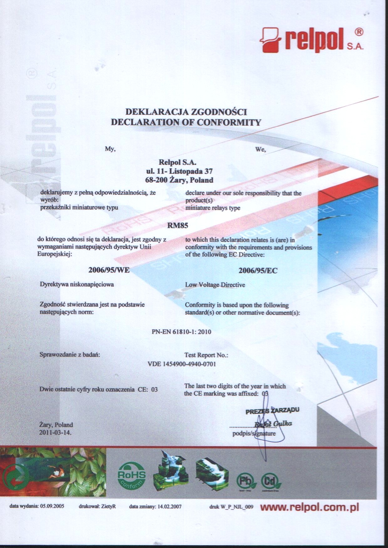 RM85 sensitive - przekaźnik elektromagnetyczny RM85-3021-25-S024 miniaturowy, do obwodu drukowanego i gniazda wtykowego. Cewka czuła o mocy 0,25 W. Raster 5 mm. Wysokość 15,7 mm. Wyjście: 1Z - jeden zestyk zwierny - wyprowadzenia: 11(7)/21(4)-14(8)/24(5); AC1 - 16 A / 250 V; DC1 - 16 A / 24 V. Wejście / cewka - wyprowadzenia: A1(1) - A2(2), napięcie zasilania Un - 24 V DC. Wymiary: 28 x 12,7 x 15,7 mm. Materiał styków: AgSnO2. IP 40. Opcje montażu gniazd: EC50, GD50, PW80 - do druku; GZT80, GZM80, GZS80 - montaż na szynie 35 mm lub przykręcane do płyty jedną śrubą M3. Uwaga: w przekaźniku są galwaniczne połączenia wyprowadzeń 11 z 21 oraz 14 z 24.